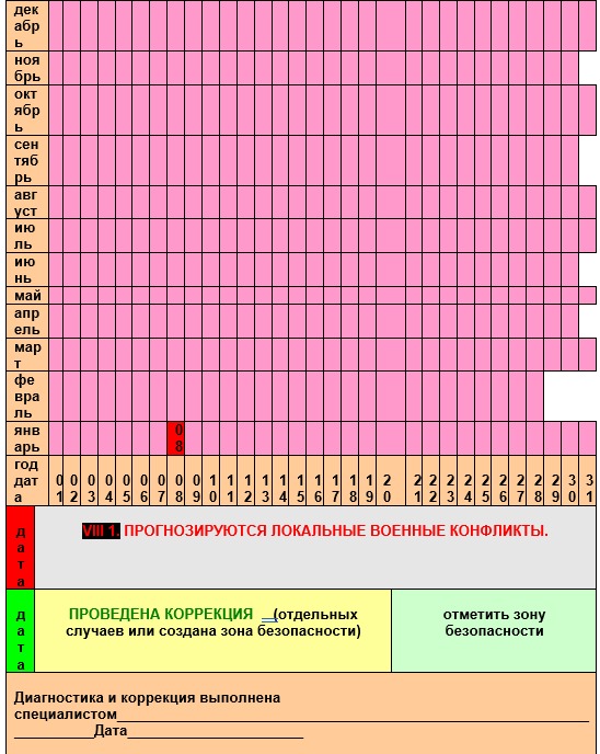 Предположим, в апреле коррекция не выполнена (рис. 1), а в сентябре она успешно завершена. Слава Богу! Отмечайте результаты на таблице разным цветом – вот и вся… «новейшая технология»! Укажите, кто провел диагностику и коррекцию, поставьте дату, когда это выполнено и своевременно отправьте ваши данные мне, а я их размещу на сайте  ISMU. За год подведем диагностически-коррекционные итоги, как я это всегда и делал (на основании своей сетки прогнозов). А там посмотрим, подтверждают ли события и правильность диагностики, и эффективность коррекции. Будем сравнивать, что произошло 07 апреля и 24 сентября.