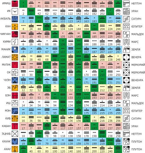 С её помощью они определяли каждый день, каждый год, каждое двадцатилетие и т.д. В таблице — 260 элементов (13×20). В двадцати строчках указаны двадцать специальных знаков, каждый из которых имеет свое имя и изображение — тотемов. Счет ведется цифрами от единицы до тринадцати — снизу вверх по столбцу, затем следует переход на следующий столбец, справа.Точка обозначает 1, черточка значит 5, и круглая морская раковина обозначает 0.