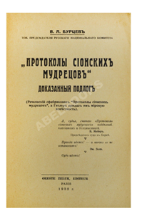 «Один из свидетелей на Бернском процессе 1934—1935 «Протоколов» Владимир Бурцев выпустил книгу «Протоколы сионских мудрецов. Доказанный подлог», где ещё раз привёл доказательства того, что «Протоколы» являются сфабрикованной фальсификацией и не имеют никакой исторической достоверности «
