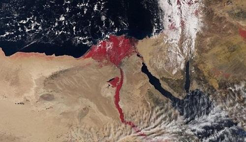 Нет, на фото не изображение Нила времени Исхода. Это Нил в 2016-м году (https://nat-geo.ru/planet/pochemu-nil-stal-krovavym-na-fotografii-sputnika/). И это происходит периодически, а не одноразово в период Исхода.