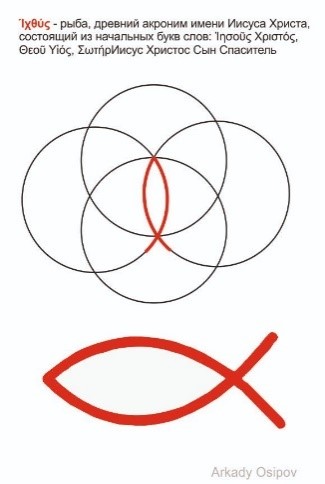 Графический символ рыбы – это петля, означающая древний сакральный символ «анкх». Напоминает букву аин (всевидящее Божественное Око, постоянный «надсмотр» и божественная забота). А в сакральной геометрии – центр Семени Жизни.