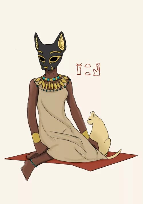 Ее отождествляют с богиней-кошкой Баст, которая в своем ужасном аспекте является богиней-львицей Сехмет. Сехмет также является богиней сражений, изрыгающей огонь. Празднование ее обрядов, как и ритуалов «дружелюбной» богини Баст, сопровождается танцами, музыкой и систрумом, но в лапе она держит львиную голову, «как будто демонстрирует, что эта страшная голова так же хорошо подходит и ей.»