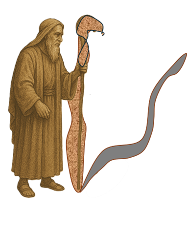 Так, Посох - это инструмент Света Моше, исправляющий его тень (выступает вместо речи, действует тогда, когда сам Моше бессилен и т. д.), . Тень от посоха - змей. Если замкнуть этот круг, получится, что посох - это точная граница между Светом и Тенью. Моше бросает Посох (отбрасывая от себя терпимость и милосердие, Божественный Свет и порядок) – и посох превращается в его тень – в змея. Моше хватает змея за хвост, (подчиняя свою тень свету и трансформируя ее), и тот вновь превращается в Посох!