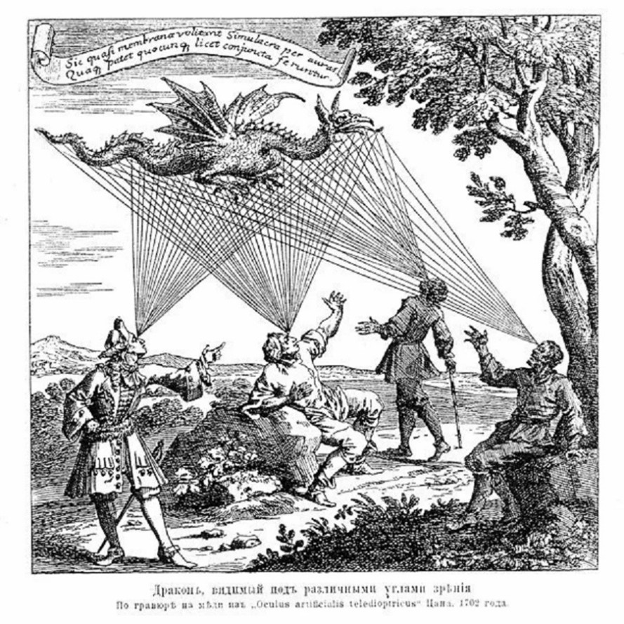 Эта гравюра — иллюстрация «Излучающий глаз. Дракон, видимый под разными углами зрения» из трактата оптика Иоганна Цана (Johann Zahn) Oculus artificialis teledioptricus sive Telescopium (Нюрнберг, 1685; расширенное издание 1702). «В этом трактате Цан описал все известные тогда оптические приборы и приёмы построения перспективы. Рисунки оттуда выглядят одновременно научно и фантастично.