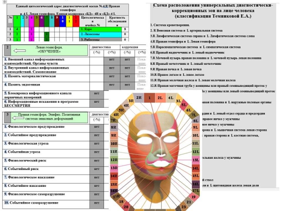 Как событийное циклическое неблагополучие начинается в детстве, когда детская психика еще ранима и неустойчива, и любое неосторожно сказанное слово может заложить сценарий «на неудачу», так физическое неблагополучие начинается задолго до того, как болезнь проявляет себя в виде внешних симптомов. Она начинается с едва заметных даже самой вегетативной системе изменений на уровне клетки и органоидов. Эта инволюционная (или дегенеративная) информация практически никак себя не проявляет, начиная разрушать и подтачивать организм изнутри, с самых тканевых, клеточных основ, за годы до органического проявления и обнаружения на рентгене и ультразвуковом обследовании. Единственный признак, по которому можно заметить приближение неблагополучия по здоровью это … появляющиеся морщинки, ухудшение тургора кожи под глазами или изменение цвета кожи лица. Женщины в таких случаях бегут к косметологу, вкалывают ботокс или гиалуроновую кислоту, делают освежающие маски. Не понимая, что проблема лежит ни в коже, ни в мышцах и даже ни в органах, а гораздо глубже. Ведь каждая зона на нашем лице соответствует тому или иному органу или системе органов.  Считывание проблемных зон с линзы лица пациента и соответствующее им отклонение физиологических параметров работы органов и систем на клеточном уровне дает возможность инфотерапевту – специалисту 4 уровня не только это отклонение исправить задолго до развития реальной проблемы по здоровью, но и помочь пациенту восстановить или сохранить МОЛОДОСТЬ И КРАСОТУ.
