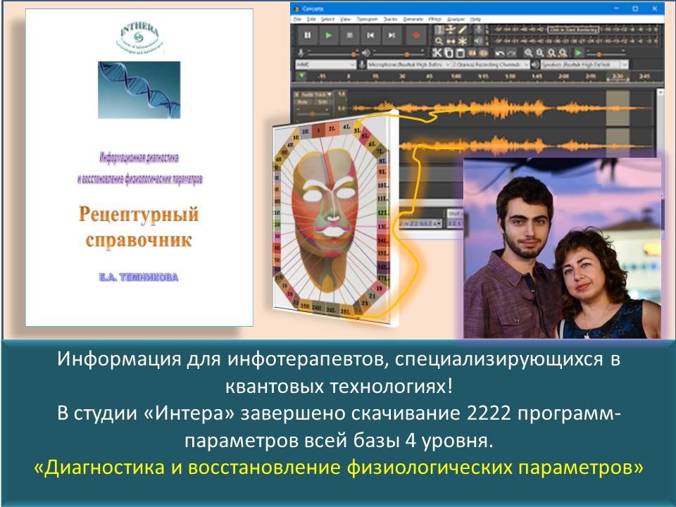 А теперь о последних новостях. В нашей студии завершена работа по созданию  квантовых версий 2222 программ 4-го уровня инфотерапии «Диагностика и восстановление физиологических параметров организма» (технология д-ра Темникова и Е.А. Темниковой).  Вкратце о том, что из себя представляет данная технология.