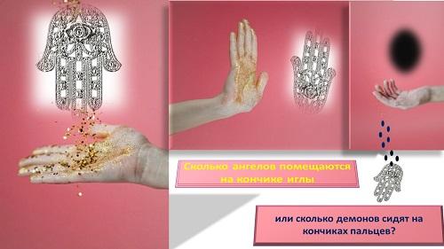 И вот что вспоминаю. На сеансах иногда провожу пациентам психокоррекцию родовых программ. В норме человека должны поддерживать его родные, буквально стоящие в энергетическом плане за его спиной. И это нетрудно проверить, есть ли у человека такая поддержка, или ее нет по тем или иным причинам. Прошу пациента закрыть глаза, представить за спиной «Семь я», то есть энергетическое древо из 7ми поколений, а потом легонько его толкаю назад, держа за плечи. Если человек стоит незыблемо — есть у него такая поддержка. Если легко отклоняется, «падает» назад – поддержки он лишен. И, разрешая родовой конфликт (не буду сейчас расписывать данную технологию), мы «разруливаем» некоторые нынешние ситуации и укрепляем его энергетически. Так вот, несколько раз во время окончания такой работы мне показался за плечами у пациентов символ хамсы. А одна пациентка даже проговорила, что увидела свою маму, держащую руку в форме хамсы и как бы благословляющую ее.