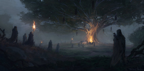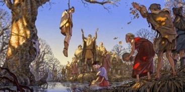 «Жертвоприношения Одину совершались также в форме повешения – подношения развешивались на деревьях в священной роще, это могли быть и обычные пироги, а также животные и люди, пленники или рабы.