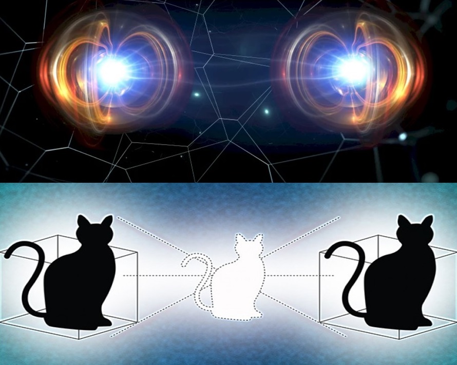 «Представим разнесённых в пространстве наблюдателей А и Б, у которых имеется по экземпляру квантово-запутанных ящиков с котами Шрёдингера, находящимися в суперпозиции «жив-мёртв». Если в момент t1 наблюдатель А открывает ящик, то его кот равновероятно оказывается либо живым, либо мёртвым. Если живым, то в момент t2 наблюдатель Б открывает свой ящик и находит там мёртвого кота. Проблема в том, что до исходного измерения нет возможности предсказать, у кого именно что окажется, а после один кот жив, другой мёртв, и назад ситуацию не повернуть.» Википедия